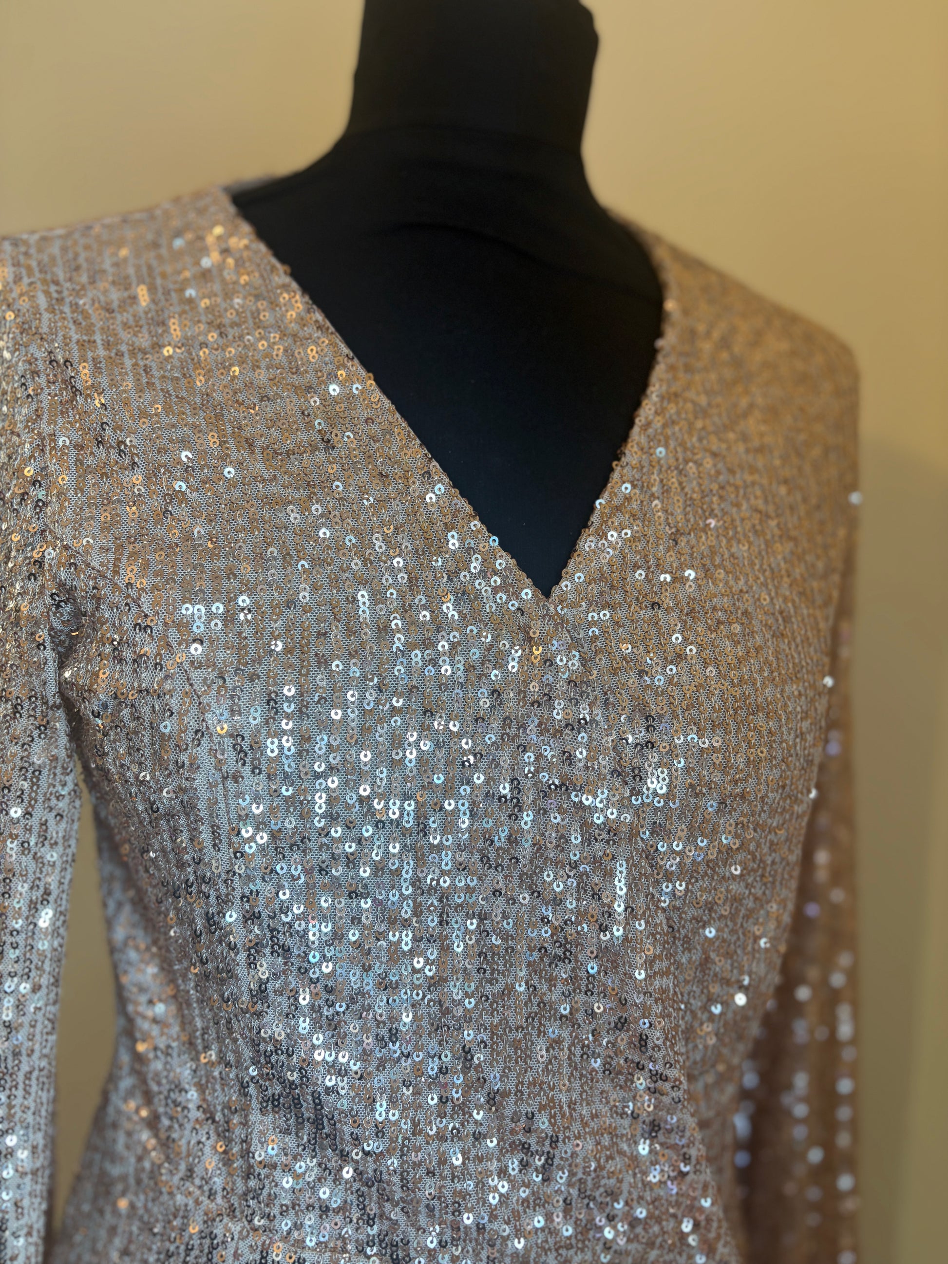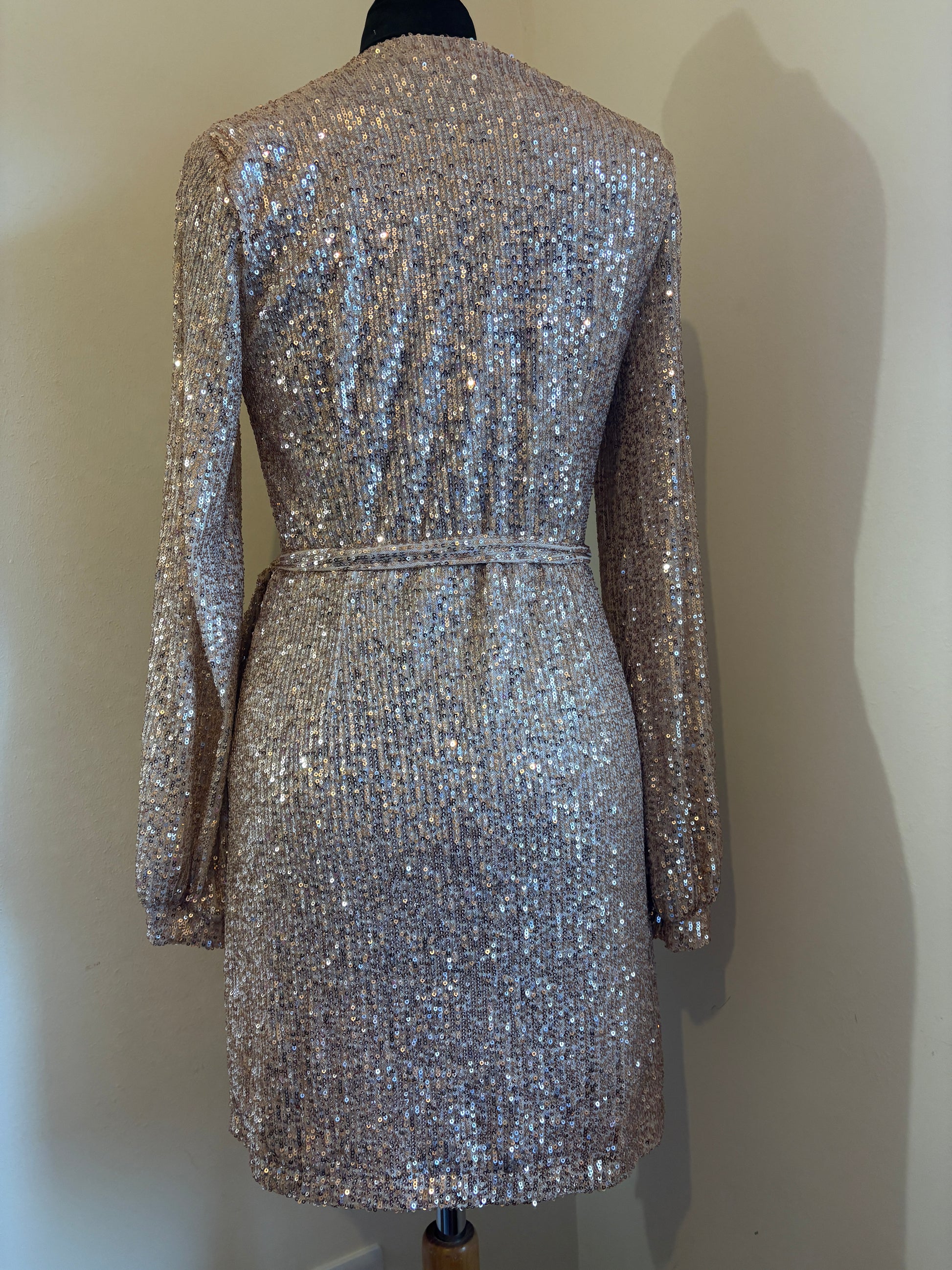 Channel timeless glamour with this retro-inspired Iconé-style sequin dress. Featuring a classic wrap silhouette, this piece sparkles with every movement thanks to its full sequin embellishment in a warm champagne hue. The long sleeves and side-tie waist create an elegant, figure-flattering shape reminiscent of vintage evening wear.